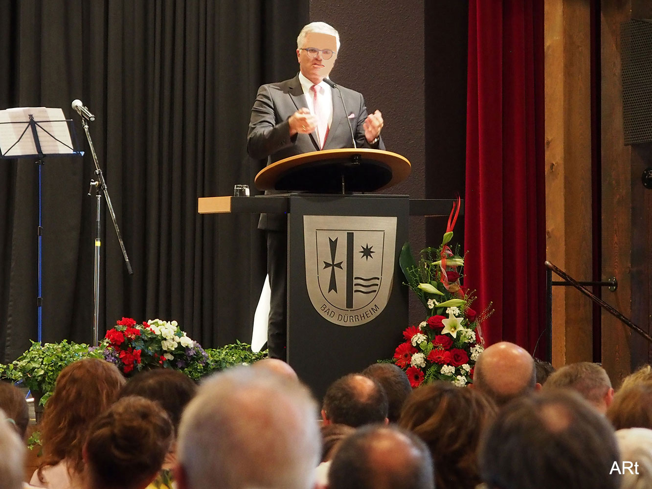 In seiner Antrittsrede knüpfte Jonathan Berggötz an das Motto seines Wahlkampfs an. „Mit Herz und Verstand für Bad Dürrheim“. So wolle er Bad Dürrheim in den nächsten Jahren voranbringen. Er beschrieb Bad Dürrheim als ein Haus, in dem viele Menschen unter einem Dach wohnen, umgeben von wunderschöner Natur, die es achtsam zu pflegen gelte. Das Fundament sei stabil und trage folgende Säulen: